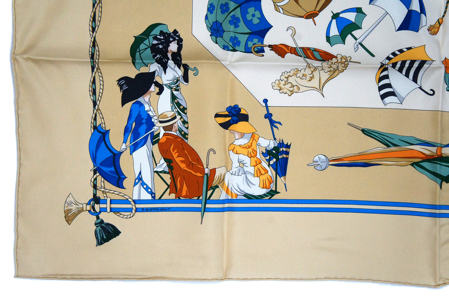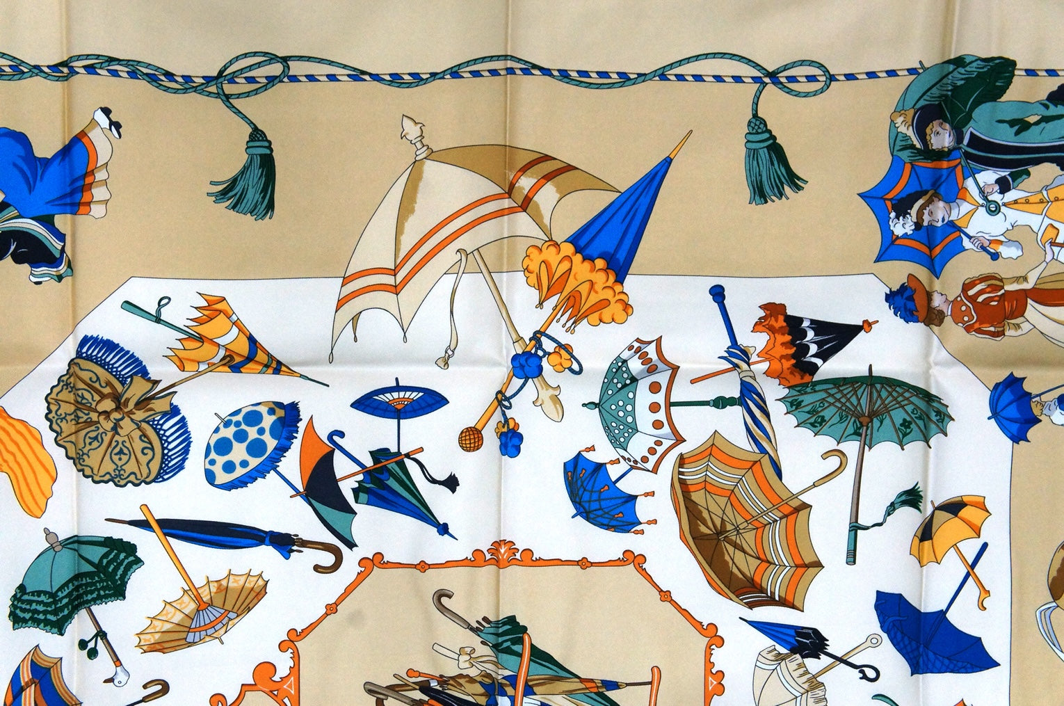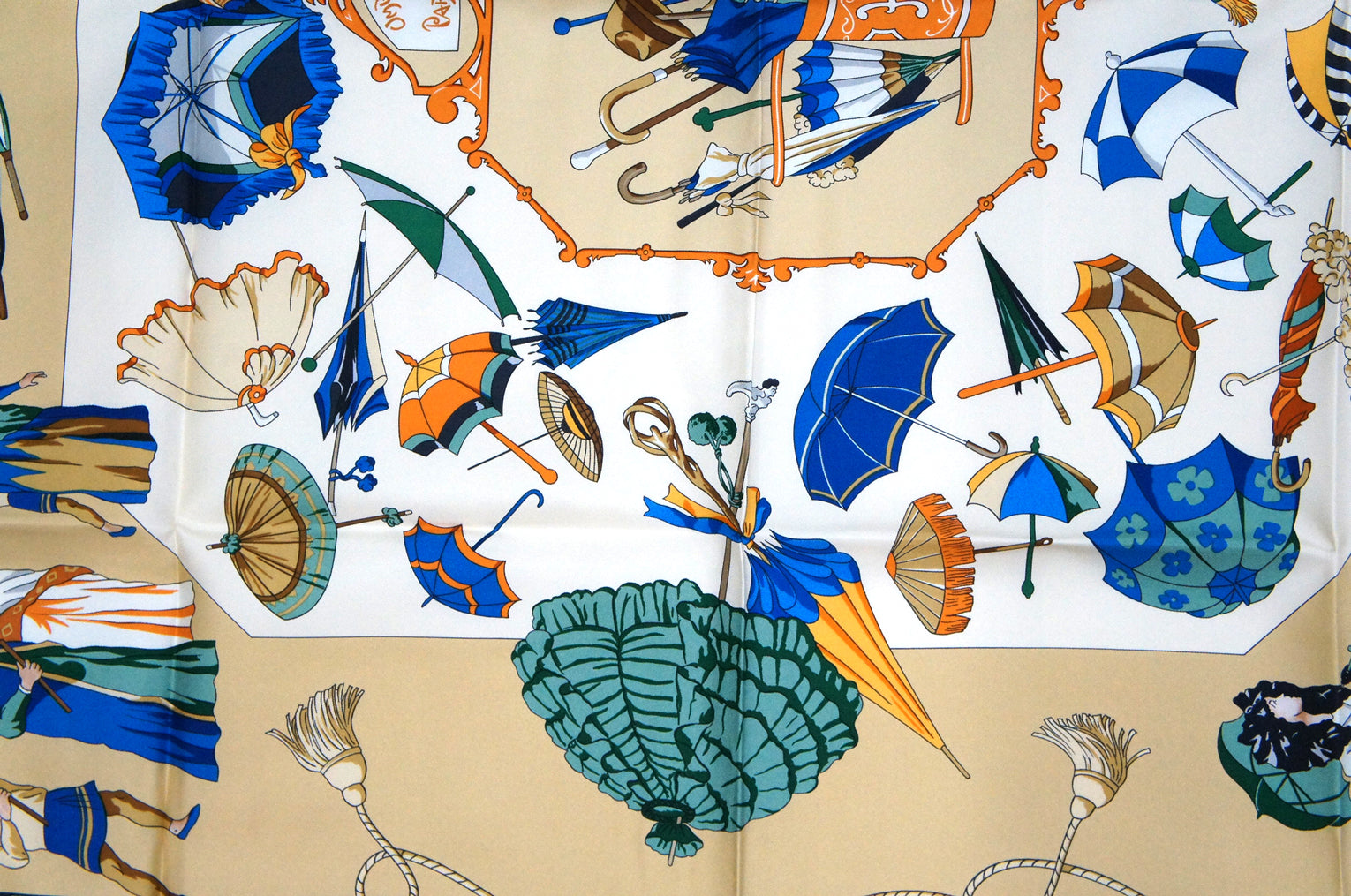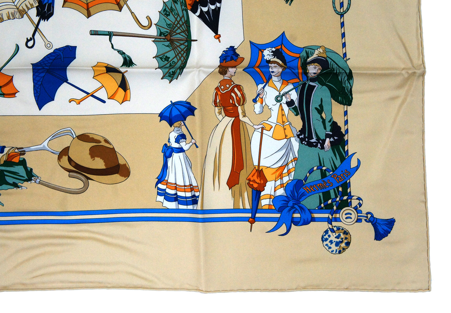 Hermes Carre 90 "Ombrelles et Parapluie" Silk Scarf in Beige and Multicolor / Free shipping