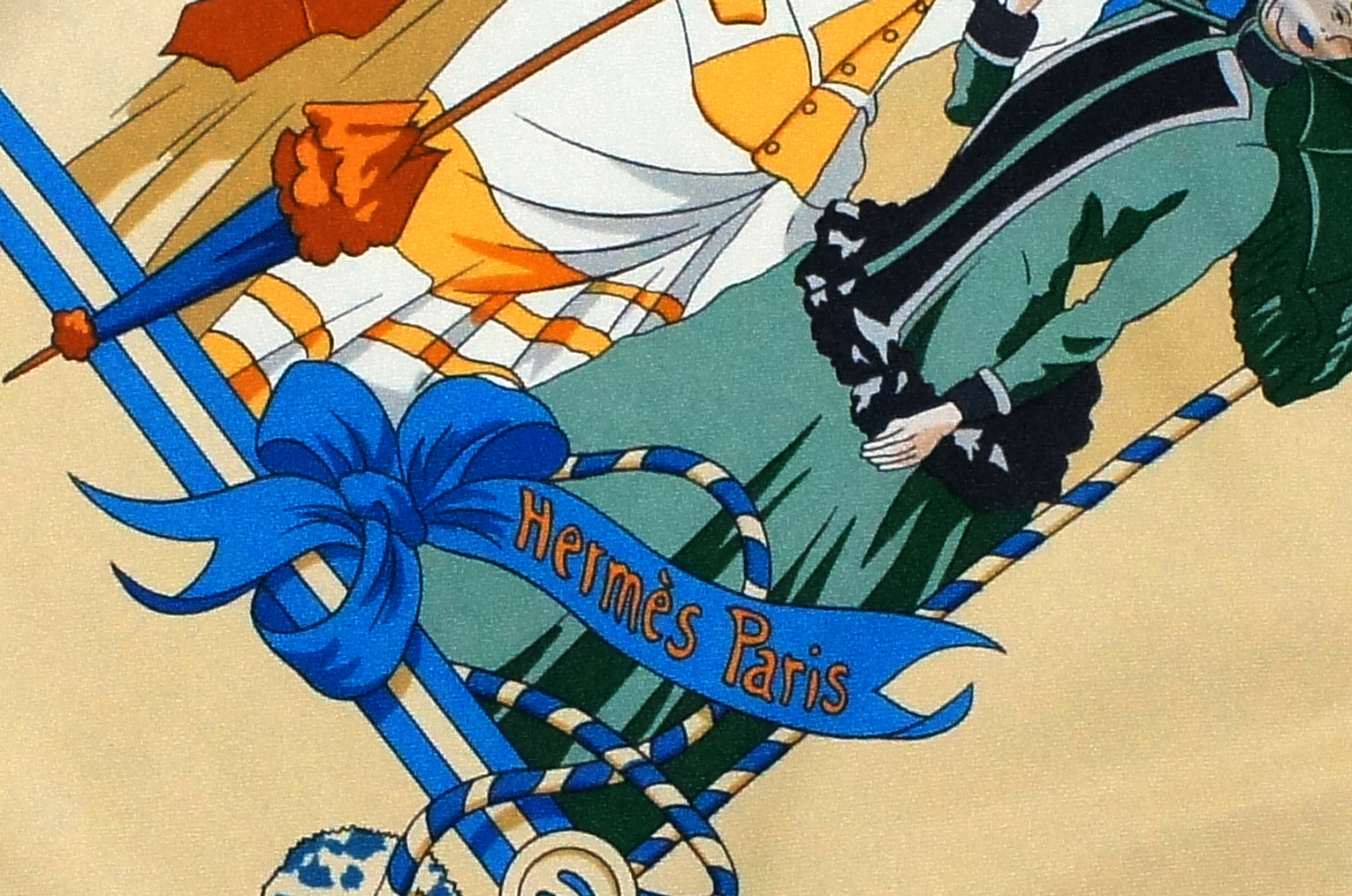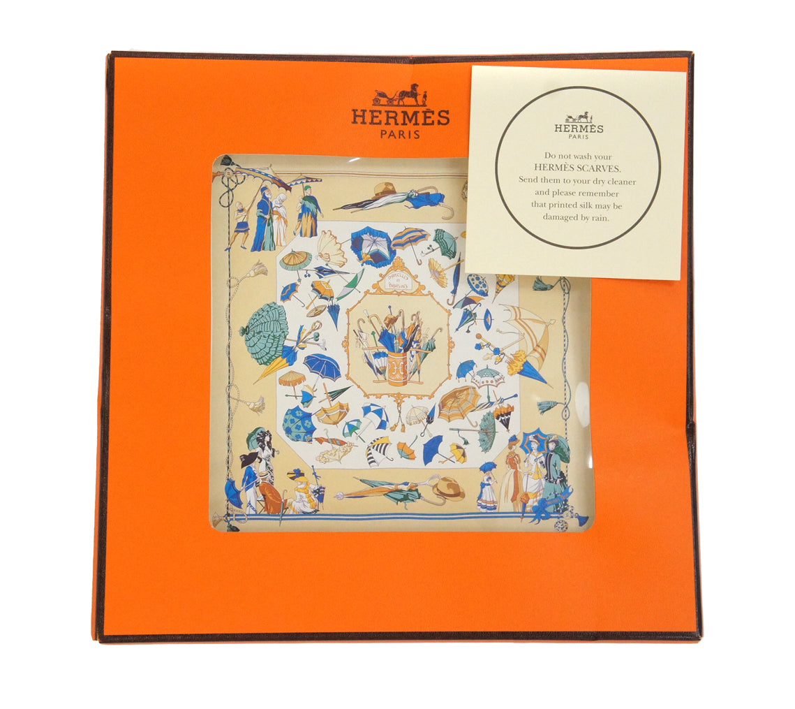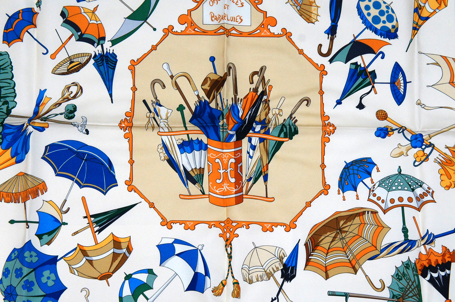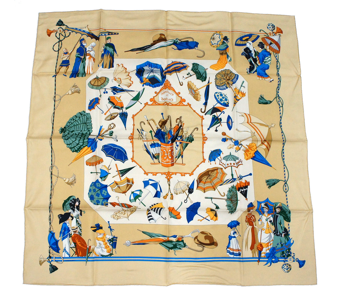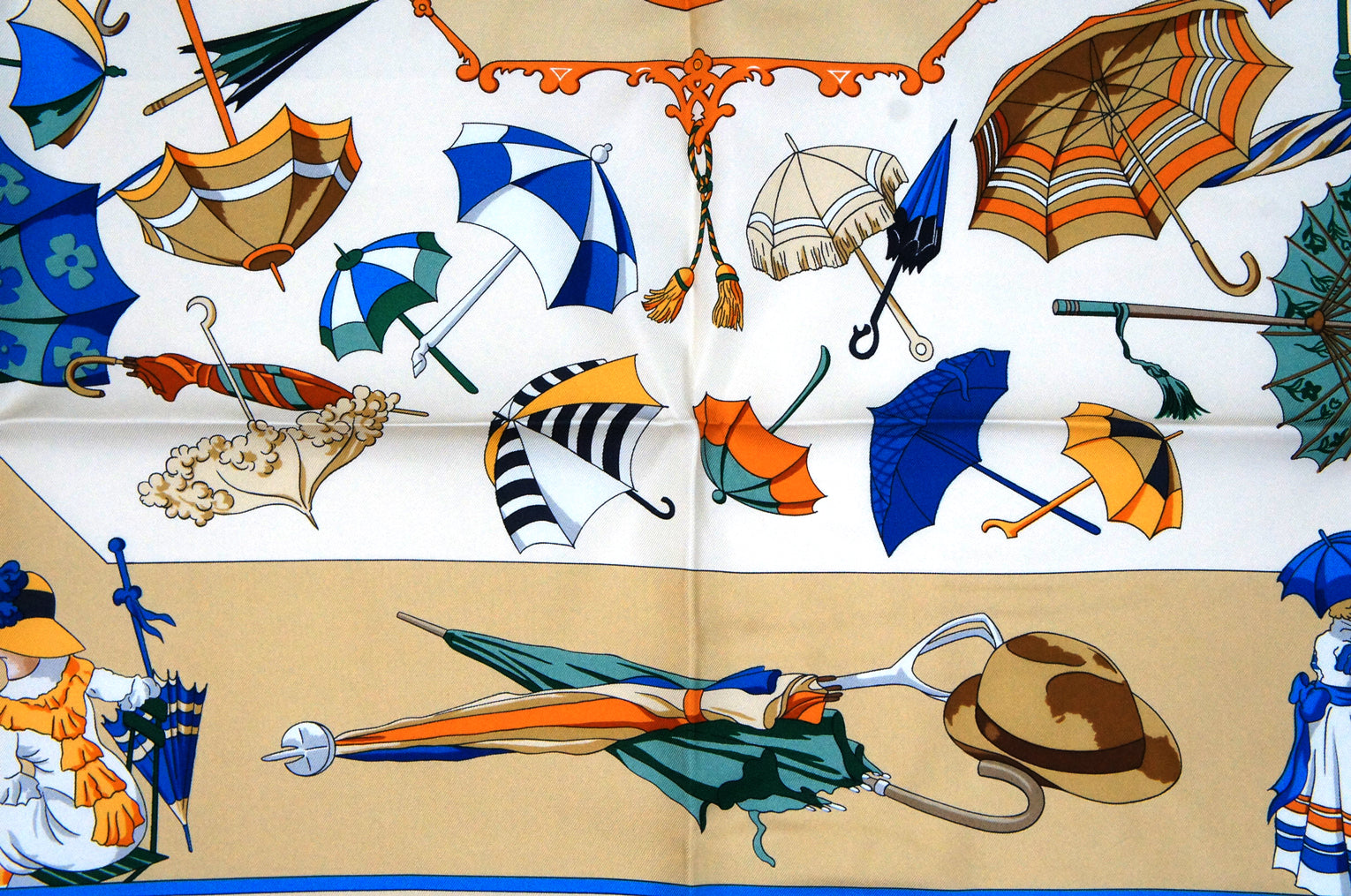 Hermes Carre 90 "Ombrelles et Parapluie" Silk Scarf in Beige and Multicolor / Free shipping