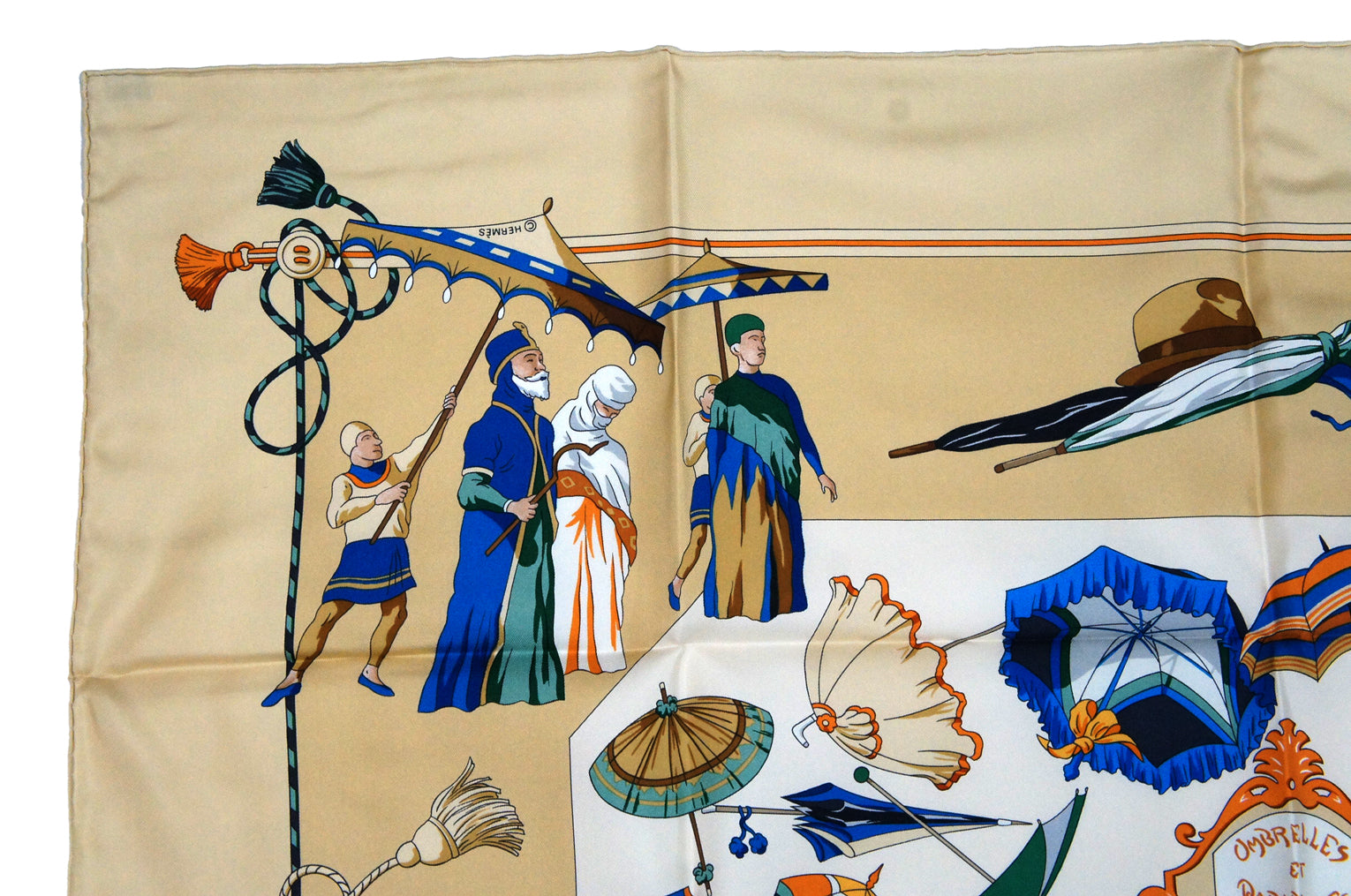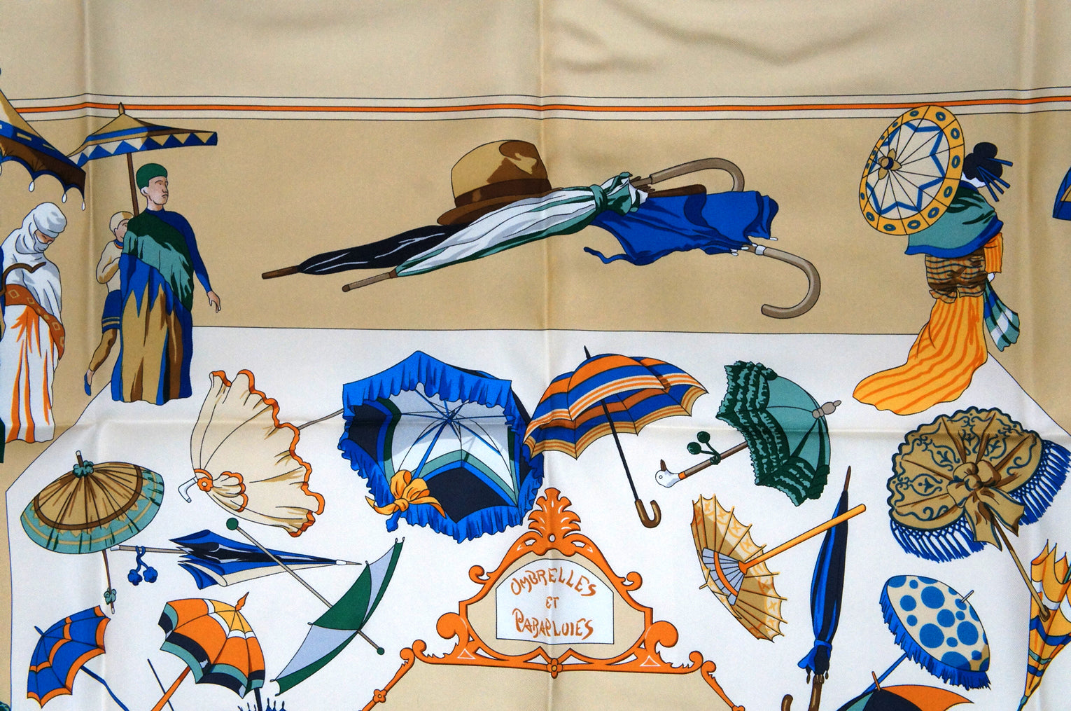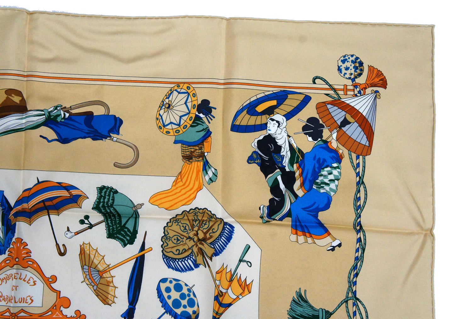 Hermes Carre 90 "Ombrelles et Parapluie" Silk Scarf in Beige and Multicolor